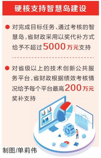 如何支持智慧岛建设?我省将给出“真金白银”硬投入。对完成目标任务、通过考核的智慧岛,省财政结合其任务完成情况,采用以奖代补方式给予不超过5000万元支持,主要用于支持智慧岛研发设计、成果转化、检验检测等公共服务平台建设和高层次人才引进;对省级以上的技术创新公共服务平台,省财政根据绩效考核情况给予每个平台最高200万元奖补支持;入驻智慧岛的科研机构、企业建设的重点实验室、技术创新中心、企业技术中心、工程研究中心等创新平台被新认定为国家级创新平台的,省财政给予每个平台500万元一次性奖励。