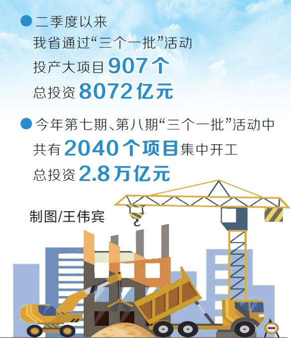 省发展改革委相关负责人介绍,今年以来,我省以拼抢之姿推动一批含新量、含金量、含绿量较高的重大项目开工建设,今年第七期、第八期“三个一批”活动中,共有2040个项目集中开工,总投资2.8万亿元,掀起了新一轮建设高潮。