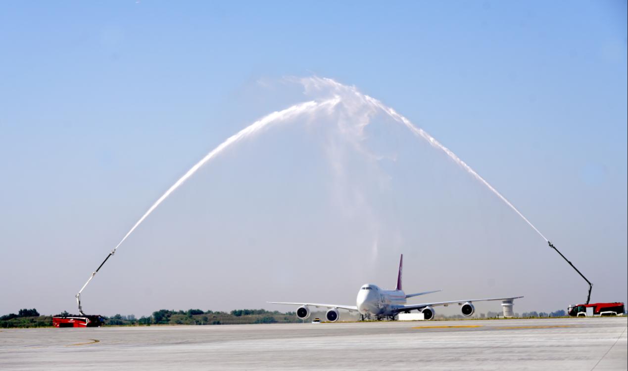 卢森堡货航“郑卢空中丝绸之路号”接受民航界最高礼仪“水门”的欢迎。姚自力摄