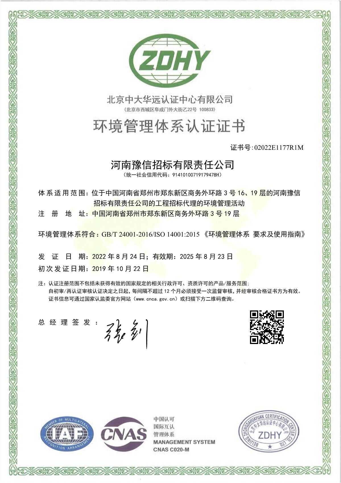 环境管理体系认证证书
