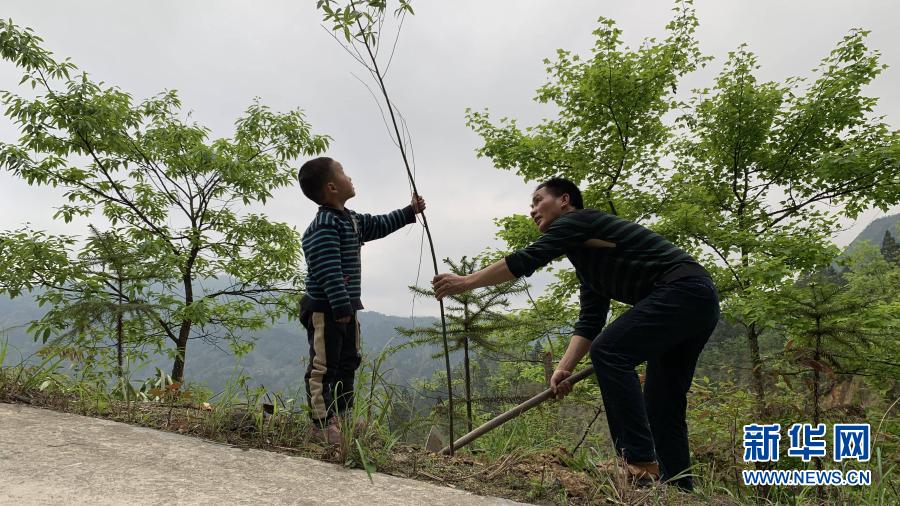 吴新仁(右)带着儿子吴良友在乌英苗寨的公路边种植景观树(2019年4月12日摄)。新华社记者 黄孝邦 摄