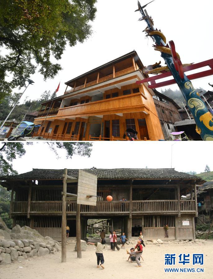 这是一张拼版照片,上图为:2020年11月20日拍摄的完成改造的乌英教学点教学楼(新华社记者黄孝邦摄);下图为:2006年9月19日拍摄的乌英教学点(龙涛摄)。新华社发
