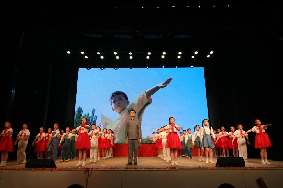 2021 年 5 月 29 日,新安小学师生在 “ 红色基因代代传 ” 全国青少年诵读党史故事(淮安区专场)活动中表演新旅故事情景剧《燃烧的信念》。纪星名 摄