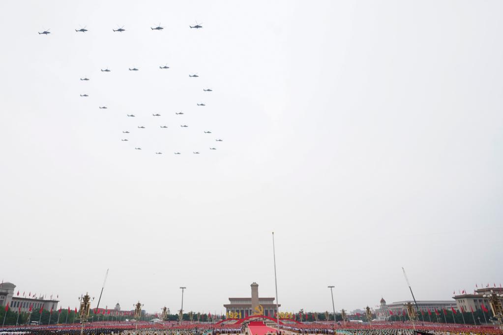 2021年7月1日上午,庆祝中国共产党成立100周年大会在北京天安门广场隆重举行。这是大会开始前的飞行庆祝表演(2021年7月1日摄)。新华社记者 高洁 摄