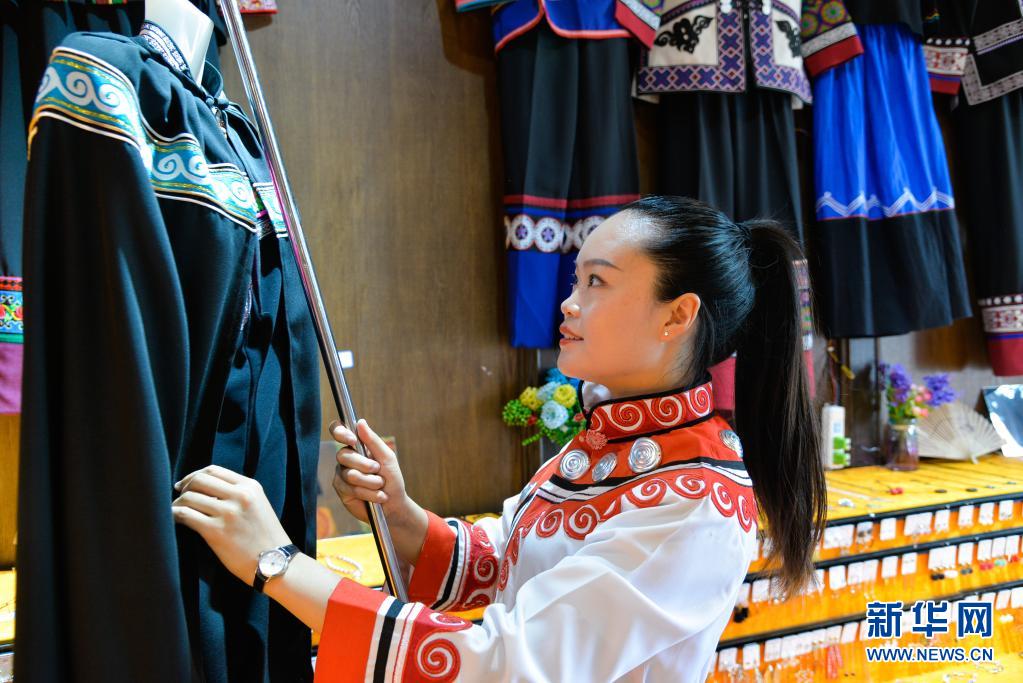 7月15日,在贵州省毕节市大方县奢香古镇,彝族姑娘龙恩碧在自己的彝族服饰和手工艺品店整理商品。新华社记者 徐钦 摄
