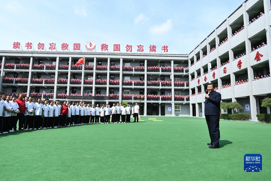 9月13日至14日,中共中央总书记、国家主席、中央军委主席习近平在陕西省榆林市考察。这是14日上午,习近平在绥德实验中学考察时,同师生亲切交流。新华社记者 谢环驰 摄
