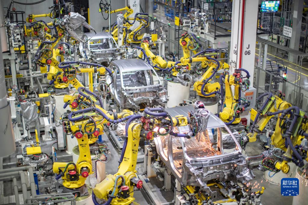在重庆金康新能源汽车有限公司,智能化焊接机器人在进行焊接作业(4月2日摄)。新华社记者 黄伟 摄
