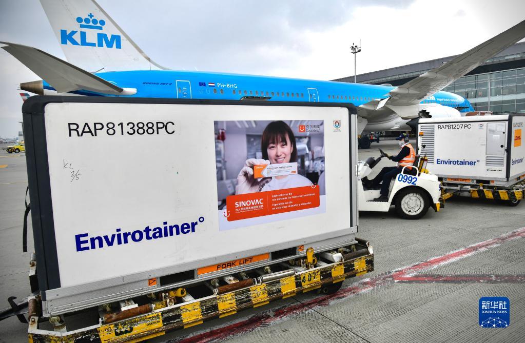 这是2021年3月6日在哥伦比亚波哥大埃尔多拉多国际机场拍摄的刚刚完成卸货的科兴疫苗。新华社发(哥伦比亚总统府供图)