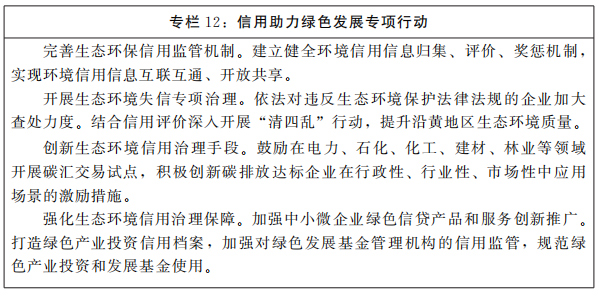 加强生态环境领域信用建设,开展生态环境失信专项治理,创新生态环境失信治理措施。强化沿黄生态、淮河生态、大别山等生态环境圈信用治理保障,结合公共信用评价和行业信用评价,制定沿黄、淮河、大别山等地区产业准入负面清单,推动高耗水、高污染、高耗能产业布局优化和结构调整。