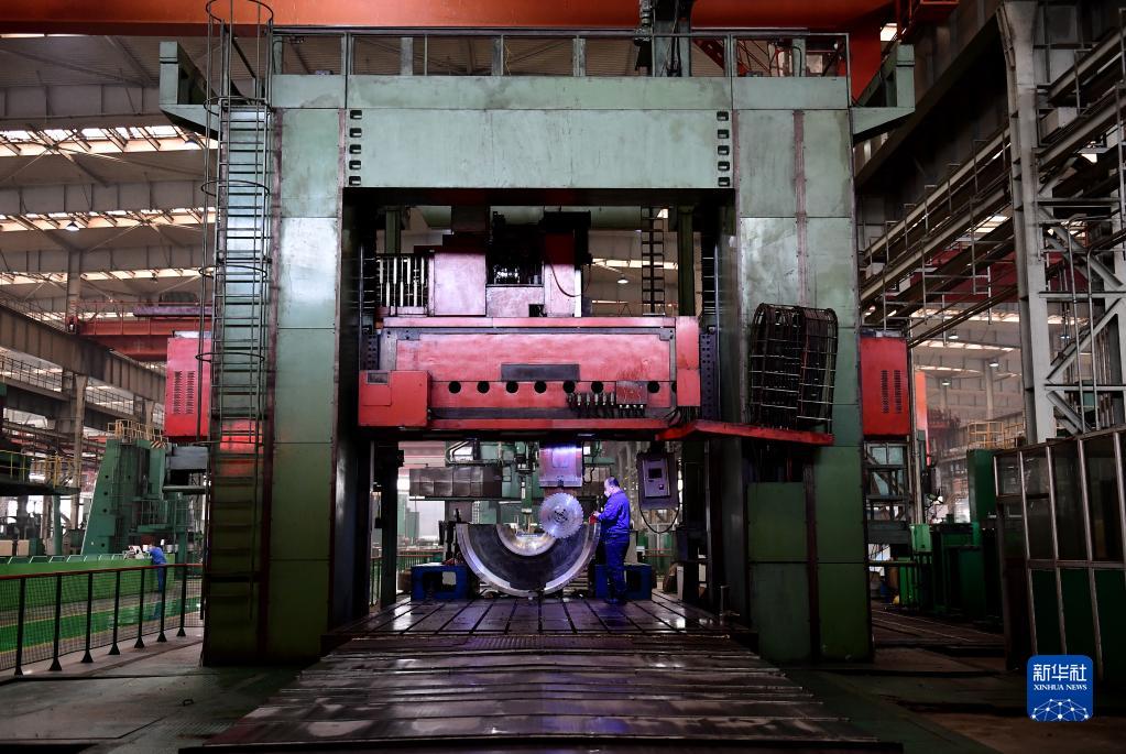 2020年3月16日,在沈阳鼓风机集团股份有限公司生产车间,工人操作机器加工产品内机壳。新华社记者 杨青 摄