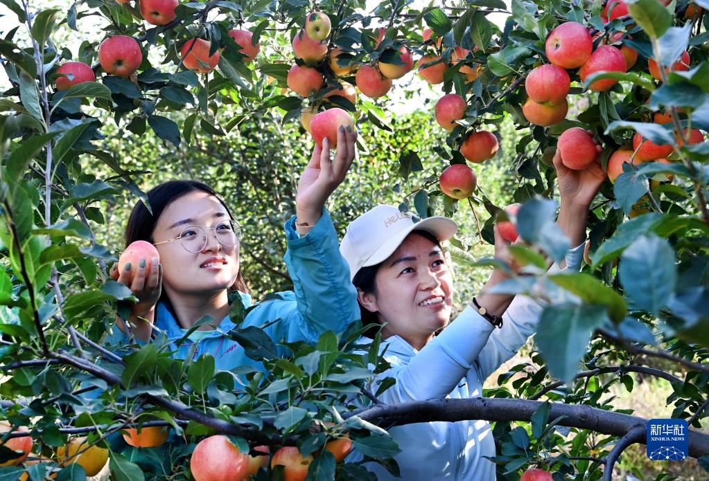 2021年9月10日,游人在陕西省榆林市米脂县高西沟村苹果采摘园采摘苹果。 新华社记者 陶明 摄
