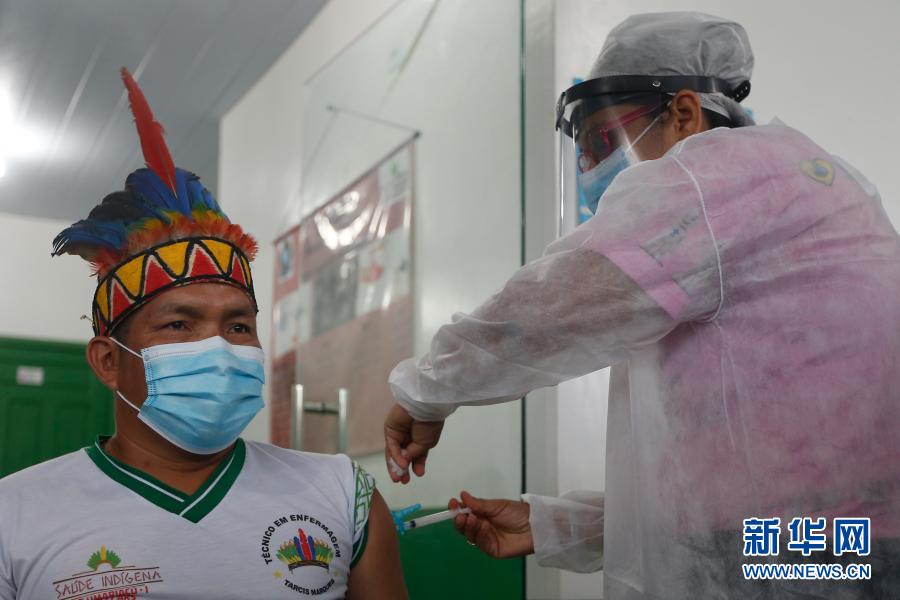 2021年1月19日,在巴西亚马孙州塔巴廷加市,医护人员为一名原住民接种中国新冠疫苗。新华社发(卢西奥·塔沃拉 摄)