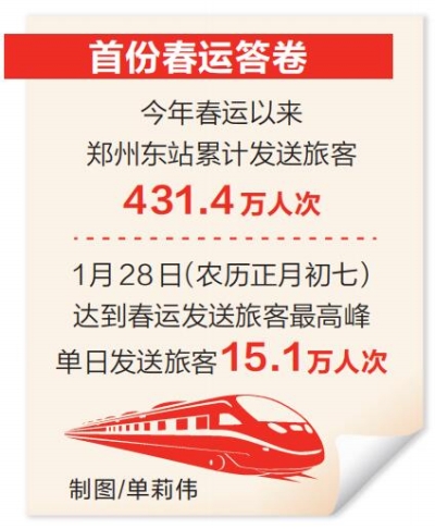 2月15日,为期40天的春运圆满收官。作为全国首个“米”字形高铁枢纽,今年春运以来郑州东站客流持续保持高位运行,累计发送旅客431.4万人次,1月28日(农历正月初七)达到春运发送旅客最高峰,单日发送旅客15.1万人次,交出了首份春运答卷。