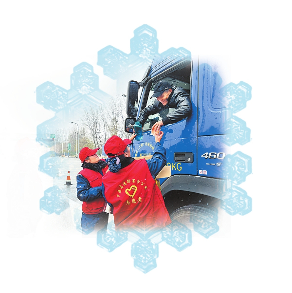 捧着“爱心简餐”,从江苏来的货车司机郑师傅连连感谢:“大家除雪这么忙还在照顾我们,非常感动。”